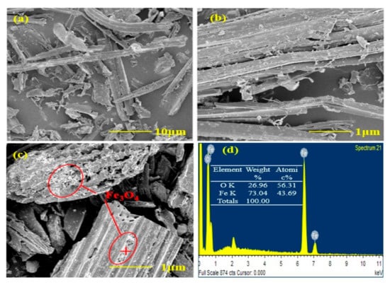 From the FTIR spectra, there are a few peaks that appeared for both pristine biochar and m-biochar (Figure 1b). The peaks at 870, 796 and 745 cm−1 were characteristic peaks of the C-H bond []. The peak at 1066 cm−1 was the C-O stretching vibration in the structure of aromatic ether, carbohydrate, or polysaccharide. The peaks near 1402, 1554 and 3028 cm−1 were the stretching vibration peaks of C=O, C=C, and of C-H on the aromatic ring []. The results agreed with the biochar characteristics that not only contain porous structure but also numerous active adsorption sites for Cr removal []. Moreover, a distinct peak at 564 cm−1 was found for m-biochar (Figure 1b), which was the characteristic stretching peak of Fe-O []. The results demonstrated magnetic modification increased the species and number of functional groups of the biochar, which may contribute to the Cr (VI) adsorption. Based on the images from the SEM analysis (Figure 2), the pristine biochar was stripped after carbonisation at high temperature, which resulted in a rough and relevant random distributed porous structure (Figure 2a,b). However, the surface morphology of m-biochar was significantly different compared to the pristine biochar (Figure 2c). The pore structure on the surface was more developed and the surface roughness was increased. Therefore, its specific surface area and pore volume (Table 1) were higher than those of the pristine biochar. In addition, nano-scale spherical particles of polymer were observed on the surface of m-biochar, which was further detected with EDS to quantify its composition (Figure 2d). The mass fraction of Fe in the m-biochar was 6.16%. The high composition of Fe3O4 further proved the success of the magnetic modification of biochar, which agreed with the XRD and FTIR characterisations.