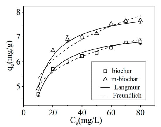An adsorption isotherm study was conducted in order to evaluate the Cr(VI) adsorption capabilities of the pristine biochar and m-biochar. Langmuir and Freundlich models were applied separately to simulate the experimental data. As illustrated in Figure 4, the Freundlich isotherm model exhibited slightly better fitting results (R2 > 0.92) than the Langmuir model (R2 > 0.90, Table 3). According to the Freundlich model, the Cr(VI) adsorption capacity of m-biochar was significantly higher than that of the pristine biochar. It may be attributed to the active Fe-O sites of m-biochar and increased specific surface area and the pore structure during the magnetisation process (Table 1). In addition, the high ion exchange capacity of the microporous surface of the biochar and a large number of oxygen-containing functional groups could significantly enhance the adsorption of heavy metal ions []. The magnetic modification increased the species and number of functional groups of the biochar and it has more active Fe-O sites, which may contribute to the Cr(VI) adsorption. Moreover, the positive charge on the surface of m-biochar increased greatly after modification which could increase the interaction with the chromium anion [].