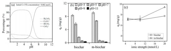 Cr(VI) in groundwater mainly existed as anionic forms, such as CrO42−, HCrO4− and Cr2O72−. It is reported that HCrO4− and CrO42− were the main forms of Cr(VI) when the solution pH was below and above 6.5, respectively (Figure 5a). Moreover, if the total chromium concentration was above 1 g/L under acidic condition, Cr2O72− would be the dominated forms []. Therefore, adsorbents with a positive charge (higher zeta potential) could benefit adsorbing Cr(VI) anions through the electrostatic attraction []. Under neutral and alkaline conditions, biochar with negatively charged, an electrostatic repulsion would be formed between the absorbents and negatively charged Cr(VI) and reduced the ability to adsorb Cr(VI).