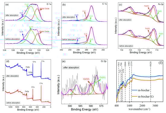 The FTIR and XPS analysis were carried out to detect the m-biochar after the adsorption in order to reveal the Cr(VI) adsorption mechanisms (Figure 6). The previous discussions demonstrated that Cr(VI) was likely adsorbed on nano-Fe3O4 of m-biochar through electrostatic interaction. The FTIR spectrum of the m-biochar after the adsorption experiment showed weakened C-H characteristic peaks at 870 cm−1 and strengthened C=O functional groups at 1402 cm−1 (Figure 6f), which may due the high oxidising ability of Cr(VI) and oxidise the -CH bond to -COO− bond []. These functional groups are reductive, however, as shown in the FTIR spectrum, they rarely participated in the reduction reactions []. The total area of O 1s peaks increased after the Cr(V) adsorption (Figure 6a), and the atomic ratio of metal oxide increased from 7.83% to 10.21%, which may be caused by the occurrence of Cr-O bond [].