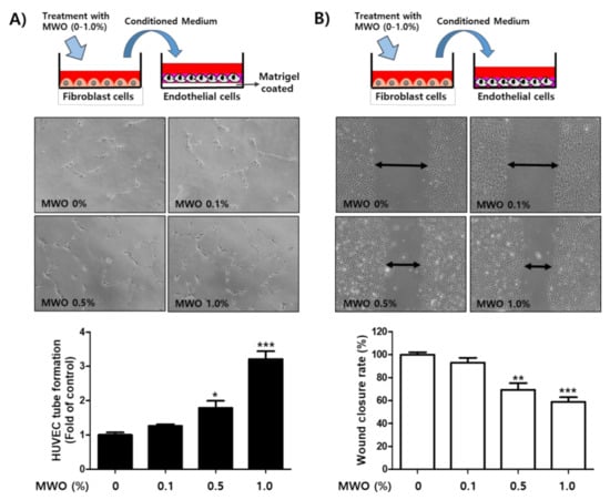 To check the capillary-like tube formation of HUVECs, these were cultured in Matrigel-coated 24-well plates [] using the conditioned media (CM) harvested from NIH-3T3 cells treated with or without MWO. For the preparation of CM, the NIH-3T3 fibroblast cells (1 × 105) seeded in 6-well plates were cultured in 1.5 mL of DMEM serum-free medium with MWO—for 24 h. After incubation, 1 mL of the CM was harvested and mixed with ECM serum-free medium at a 1:1 ratio. The HUVECs were incubated with the mixed CM in matrigel-coated 24-well plates. After 12 h incubation, the tube formation of each well was photographed with a Nikon (ECLIPSE, TS100, Melville, NY, USA) light microscope.