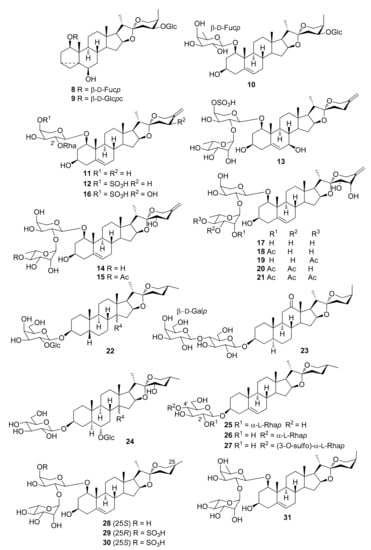 The most characteristic secondary metabolites isolated from Dracaena and Sansevieria are steroids, flavonoids, stilbenes, and saponins; flavonoids and saponins form the largest groups. The structures and bioactivities of phenolic constituents, flavonoids and stilbenoids have been reported in recent reviews [,]. On the other hand, there is great interest in saponins due to their intriguing structures and the potent analgesic, anti-inflammatory, antimicrobial, antioxidant, antiproliferative, hypocholesterolemic, and cytotoxic activities [,,]. This paper describes the about 180 different saponins isolated from 14 Dracaena and 3 Sansevieria species that have been investigated so far for these metabolites. Biological activities have been summarized at the end of the paper. Most structures have been determined in the last twenty years. The literature has been retrieved from the databases Reaxys®, Scifinder®, and Google Scholar until the end 2020. A partial list of saponins isolated from Dracaena and Sansevieria species has been included in an earlier review on the Agavaceae family [].
