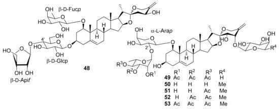 The most characteristic spectroscopic data of saponins are briefly summarized below. In addition, the consultation of the reference literature [,,,] is highly recommended.