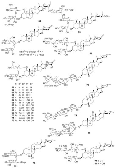 Sugar units are attached through an acetal linkage to a hydroxyl group on the steroid core. The most common glycosylation sites are 1-OH, 3-OH, and 24-OH in spirostanes, and 1-OH, 3-OH, and 26-OH in furostanes (Table 1). The hydroxyl groups, 24-, 25- and 26-OH are usually monoglycosylated, whereas a branched oligosaccharide moiety is commonly attached to the other sites. An α-L-arabinopyranosyl residue is commonly attached to 1-OH, whereas 3-OH and 26-OH are mainly β-D-glucosylated; a β-D-fucopyranosyl moiety is the typical substituent of 24-OH (Table 1). In branched oligosaccharides, an α-L-rhamnopyranosyl group is almost invariably attached to 2′-OH, whereas a β-D-xylopyranosyl unit, an α-L-rhamnopyranosyl group or, less frequently, a β-D-glucopyranosyl residue is bonded to 3′-OH. An α-L-rhamnopyranoside moiety is also the common substituent at 4′-OH. Interestingly, β-D-fucopyranose and α-L-arabinopyranose, except for saponin 84, have never been found as inner components of branched oligosaccharides in Dracaena and Sansevieria saponins. β-D-Galactopyranose has been identified as the terminal sugar of linear trisaccharide moieties (e.g., 74).