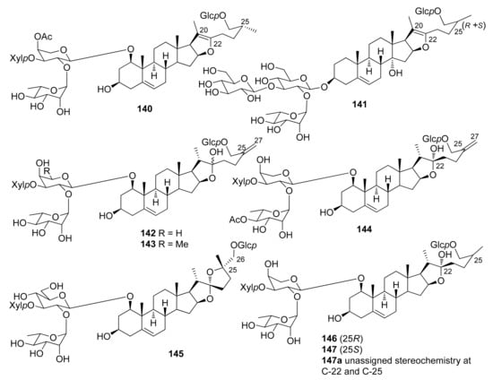Commonly found olefinic hydrogen H-6 and exomethylene protons H2–27 in spirostane analogues resonate at δ 5.25–5.60 and 4.75–4.85, respectively. Olefinic carbons resonate at δC 139–140 (C-5), 121–125 (C-6), 140–145 (C-25), and 108–110 (C-27) in spirostanes and at about δC 104 (C-20), 152-157 (C-22) in the case of furostane analogues.