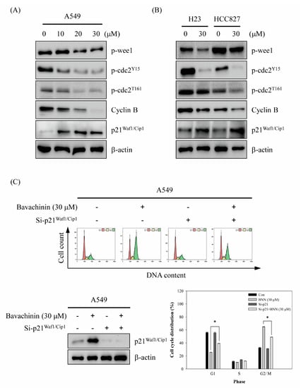 A high mutation rate in the cell cycle regulators has been reported in NSCLCs []. Therefore, targeting the cell cycle regulators may be a strategy for lung cancer prevention and treatment. The restraint of lung cancer proliferation via bavachinin, which is the active component of Proralea corylifolia L., was assessed in the present study. The results revealed that the cell viability of three NSCLC cell lines were repressed by bavachinin treatment. However, the inhibitory effect of cell viability on the human bronchial epithelial cell line, 16HBE, was only perceived in 30 μM of bavachinin treatment, for more than 48 h. The analyses of cell cycle distribution showed that a significant increase in the G2/M cell population was discovered in three NSCLC cell lines. Moreover, bavachinin induced the expression of p21Waf1/Cip1, and increased the p21Waf1/Cip1 and cyclin B/cdc2 complex association. Silencing the expression of p21Waf1/Cip1 repressed bavachinin-induced G2/M cell accumulation. In addition, bavachinin-induced p21Waf1/Cip1 expression, via p38 MAPK-regulated transcriptional mechanisms, was recognized.