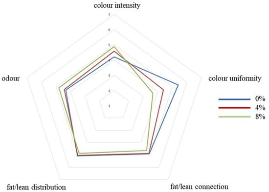 A sensory evaluation was then performed. The panel consisted of the same 20 assessors. The tasters were asked to test the beef burgers for the following characteristics: colour uniformity, colour intensity, fat/lean connection, fat/lean distribution, odour (global intensity), flavour (intensity), salty flavour, acid flavour, bitter flavour, sweet flavour, spicy flavour elasticity, hardness, cohesiveness, chewiness, juiciness, fattiness, and overall acceptability. The assessors were also asked to indicate their food preferences, in particular whether they usually like to consume meat or not. Each assessor was given sheets with a 7-point (unnumbered to avoid biased assessment) scale for each characteristic: 7 = maximum intensity and 1 = minimum intensity. The evaluations were performed in individual booths, built according to the criteria of the International Standard Organization (ISO 4121:2003) []. Samples were prepared as described for the triangle test. Water and unsalted bread were provided to cleanse the palate between samples. Assessments were carried out under natural light at a room temperature of 20 ± 2 °C. The individual scores for each assessor were then averaged to give a score for the taste panel as a whole. Three evaluations for each different batch of beef burgers were performed. Each evaluation was carried out in different test sessions at the same time of day, between 10 and 12 a.m.