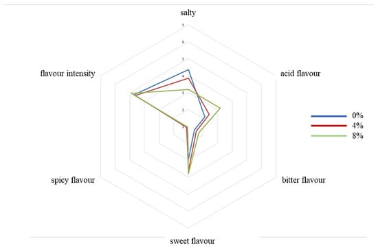 At first, a triangle test was performed according to the International Standard Organization (ISO 4120:2021) []. The triangle test is described as a forced-choice procedure to determine whether a perceptible sensory difference or similarity exists between samples of two products. In this study the test was used to determine if there was a perceptible difference between the three types of beef burgers (fortified with 0%, 4% and 8% apple pomace). Each pair was tested singularly (0% vs. 4%, 0% vs. 8% and 4% vs. 8%). Beef burgers were prepared and cooked as described before. Each beef burger was cut into six parts which were served in groups of three (two of the same and one different) on plastic dishes. Samples were prepared out of sight of the assessors and coded using three-digit numbers chosen randomly. Subdued illumination was used to mask any appearance differences. A total of 20 previously trained assessors were chosen and the test objectives were clearly defined. The number of assessors was calculated according to ISO 4120:2021 regulations for a test with α-risk = 0.05 (probability of concluding that a perceptible difference exists when one does not, also known as Type I error or false positive rate), β-risk = 0.1 (probability of concluding that no perceptible difference exists when one does, also known as Type II error or false negative rate) and pd = 50% (the proportion of assessments in which a perceptible difference is detected).