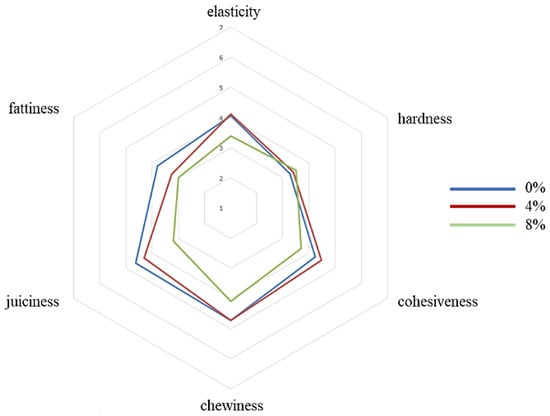 Sensory descriptive analysis. Texture attributes. (0%, control; 4%, burgers added with 4% apple pomace; 8%, burgers added with 8% apple pomace).