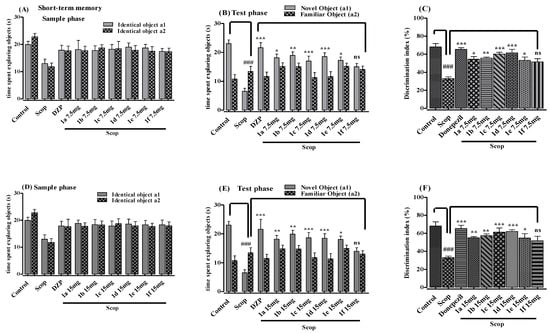 The synthesized curcumin analogs (1a–1f) for memory-enhancing potential using the NORT mice model were evaluated, and the results are presented in Figure 4. In the short-term memory, there was no significant change observed in sample phase in the exploration time for both identical objects when treated with all sample compounds. There was a significantly higher exploration time for the novel object than the identical object recorded in the test phase when treated with synthesized compounds at 7.5 and 15 mg/kg and standard donepezil at 2 mg/kg. Pretreatment with donepezil has significantly enhanced the time spent in seconds (21.59 ± 1.44 (p < 0.001)) exploring the novel object with 65.26% DI and it was reduced for the familiar object (11.49 ± 1.39 s 32.32% DI) as compared to the amnesic group. Synthesized curcumin analogs 1c with a discrimination index of 60.16% (p < 0.001) and 61.25% (p < 0.001) at both doses, respectively, and 1d with 61.43% (p < 0.001) and 62.03% (p < 0.001) showed promising results with a significantly higher exploration time compared to the amnesic group. Similarly, in this study, compound 1a with a DI of 54.53% (p < 0.05) and 55.10% (p < 0.01) at both doses, respectively, showed promising results, and 1b with a DI of 55.68% (p < 0.01) and 57.47% (p < 0.01) showed significant results at both doses, respectively, while 1e and 1f showed no promising potential in comparison with the amnesic group. After 24 h of the short-term memory evaluation, in terms of long-term memory, the synthesized curcumin analogs were tested and the results indicated that 1c and 1d showed a significant improvement in comparison with the amnesic group, with a DI of 60.58% (p < 0.001), 62.28% (p < 0.001), and 63.78% (p < 0.001), 64.61% (p < 0.001) at both doses, respectively. Compound 1b demonstrated moderate memory-enhancing activity with a DI of 52.45% and 53.61% (p < 0.05) at both doses, respectively, while 1a, 1e and 1f showed no significant change.