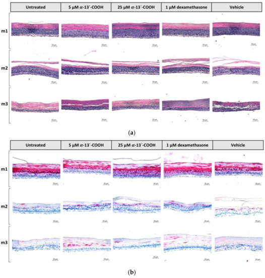An anti-inflammatory effect of α-13’-COOH was detected by evaluating the cytokine secretion (Figure 8). Our previous results showed that histamine increases the secretion of the pro-inflammatory cytokines IL-1α, IL-6 and IL-8 in our atopic dermatitis skin models m2 and m3, when added at day 9 to the medium (Figure 4c,d). Anti-inflammatory properties of 25 µM α-13’-COOH were detected as reflected in lower levels of IL-1α and IL-6 secretion in both diseases-associated skin models m2 and m3 compared to disease controls (Figure 8a). This effect was comparable to that of dexamethasone. Vehicle control with DMSO showed reducing effects on IL-6 secretion and pro-inflammatory properties for IL-1α (Figure 8a).