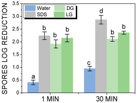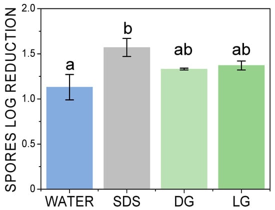 Spores log reduction on the plate under static dipping conditions as a function of the surfactant in comparison to water. The small letters a–b indicate groups of statistical differences according to Tukey’s test (p < 0.05).