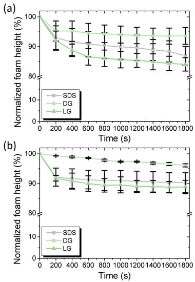 Evolution of the foam height for SDS, DG, and LG: (a) before the foam passed through the duct containing the plate contaminated with spores and (b) after the foam passed through the duct.