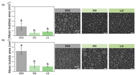 Mean bubbles area of the foams produced with SDS, DG, and LG with the corresponding microscopic pictures: (a) before the foam passed through the duct containing the plate contaminated with spores and (b) after the foam passed through the duct. The scale bar represents 1 mm for all the foam pictures. The small letters a–b indicate groups of statistical differences according to Tukey’s test (p < 0.05).