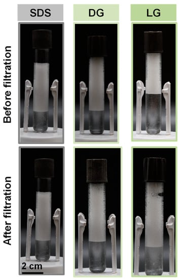 Pictures of the foams produced from the surfactants solution (SDS, DG, and LG) before and after filtration to remove the spores, showing a similar foamability and foam stability around 5 min after producing the foam. The scale bar represents 2 cm for all the pictures.