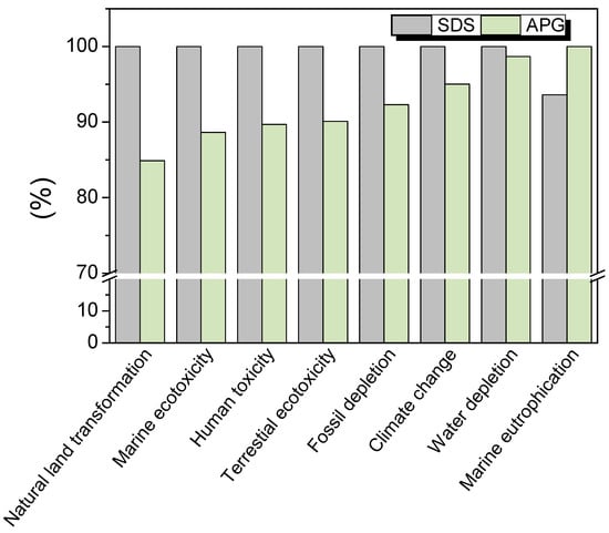 The results of the LCA modeling obtained by the ReCiPe method are shown in Figure 7 and in Table S1 (in Supplementary File). We compared the foams studied previously with SDS (reference system) with foams produced with APGs [,]. It is important to notice that for the LCA analysis, we chose the fatty alcohol sulfate from renewable resources and not from petrochemical sources to reduce the possible impact of SDS []. In this study, for foams produced by both surfactants (SDS and APG), the contribution of the process parameters (water consumption for surfactant solution preparation, pump energy consumption, and compressed air consumption) contributed mainly to the impact of the process in the same way. The pump energy consumption seemed to be the major contributor to most of the impacts studied. By comparing the processes of cleaning with foam formulated with SDS and with APG, we observed that the most important impact of using APG instead of SDS was for natural land transformation (15% of reduction). For terrestrial ecotoxicity, the use of APG reduced the impact by around 9%. The negative impact of SDS for these two parameters came from the fatty alcohol sulfate used to produce SDS. This result was not surprising, as the fatty alcohol sulfate was reported to be a harmful contributor to most environmental impact indicators in previous LCA studies comparing different surfactants formulations for cleaning []. For marine ecotoxicity, human toxicity, fossil depletion, and climate change, the use of APG reduced them by around 11, 10, 8, and 5%, respectively. For these parameters, the fatty alcohol sulfate was the second most important contributor, after the pump energy consumption (present in both surfactant foam processes). For water depletion, the impact of using APG instead of SDS was very low, around 2%. For this parameter, the fatty alcohol sulfate was the third most important factor, after the pump energy consumption and the water consumption, which were present in both foam processes. For marine eutrophication, the use of APG increased the impact in a negative way in comparison to SDS (around 6% of increase). Although the main contributor to marine eutrophication was the energy consumption of the pump, which was found in both processes, the potato starch used to produce the APG had a negative impact. We can conclude that the most harmful process was the one formulated with SDS, as it had a major contribution to all impacts except marine eutrophication. From the LCA study, the foams based on APGs helped to further decrease the environmental impacts of the cleaning process in comparison to the foams based on SDS used in the previous studies, even when SDS synthesis is not entirely coming from petrochemical resources [,].