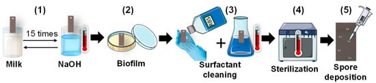 Different steps of stainless-steel plate surface preparation methodology: (1) 15 cycles of immersion of the plate in milk at room temperature for 30 min and in sodium hydroxide at 70 °C for 30 min; (2) biofilm formation on the plate; (3) rubbing of the plate with commercial undiluted surfactant (RBS) followed by immersion of the plate in surfactant aqueous solution at 5 wt.% at 60 °C for 10 min; (4) the plate sterilization in a hot air oven at 180 °C for 1 h; (5) soiling of the plate with 5 drops of 1 μL of the spore suspension at a concentration of 108 CFU.mL−1.