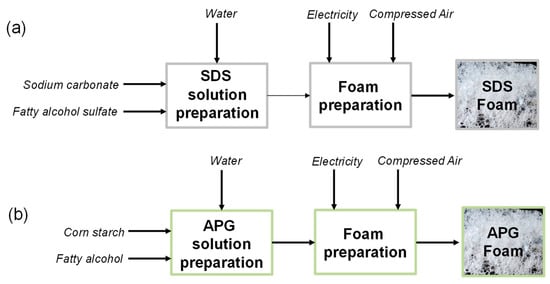 The process flowchart for the foam cleaning process formulated with: (a) SDS and (b) APG.