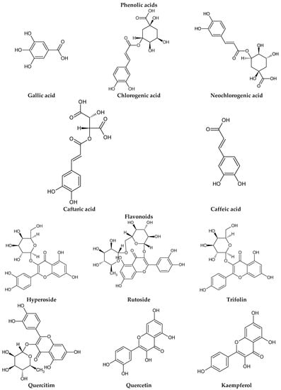 The presence of lignans was confirmed in the leaves and shoots of S. henryi; these lignans belonged to the following groups: (1) dibenzocyclooctadiene: gomisin G, schisanterin A, benzylgomisin Q, deoxyschisanadrin, and schisandrin; (2) aryltetralin: wulignan A1 and A2, epiwulignan A1, enshicin, epienshicin, and dimethylwulignan A1; (3) dibenzylbutane: henricin A and B and isoanwulignan (Figure 4) [,,]. In tests conducted by a team from the Department of Pharmaceutical Botany, the Jagiellonian University Medical College, the following compounds were detected: dibenzocyclooctadiene lignans: schisandrin, gomisin G, schisantherin A and B, deoxyschisandrin, and schisandrin C (Figure 3); phenolic acids: gallic, chlorogenic, neochlorogenic, caftaric, and caffeic; and flavonoids: hyperoside, rutoside, trifolin, quercitrin, quercetin, and kaempferol (Figure 5) [].