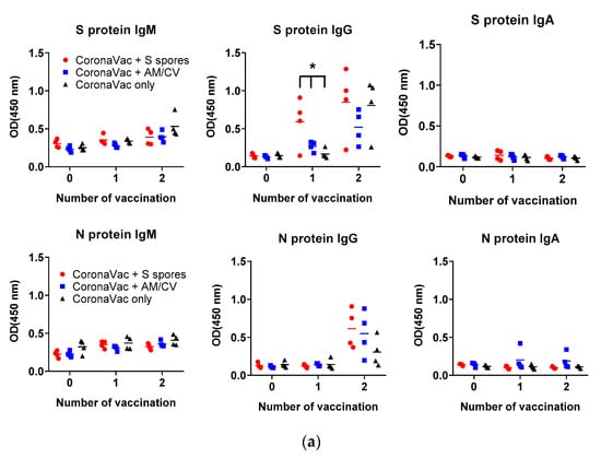 The antibody production (IgA, IgM, and IgG against SARS-CoV-2 spike (S) and nucleocapsid (N) proteins) in the serum of all tested groups are shown in Figure 8. The antibody levels (IgA, IgM, and IgG against SARS-CoV-2 S and N proteins) of all groups tested were low on Day 1. After the first CoronaVac vaccination, a slight increase in IgM against both N and S proteins was observed in all vaccinated groups with no significant difference (all p > 0.05). For IgG antibodies against the N protein, the activities were low compared to the sera IgG before vaccination. A significant increase in IgG production against the S protein was observed only in the S spores-fed group (p < 0.05), suggesting that oral administration of S spores 14 days before CoronaVac could enhance the production of antibodies against the S protein of SARS-CoV-2. In the mice fed with AM and CV, IgM and IgG antibody activities against both N and S proteins were similar to those in the group that received CoronaVac alone. Notably, one mouse in the AM/CV group produced a relatively higher level of IgA against N protein after the first and second CoronaVac vaccinations. After the second CoronaVac vaccination, higher concentrations of IgG against S protein were observed in all vaccinated groups compared to the serum activities of the corresponding groups after the first vaccination. For N protein, higher levels of IgG against N protein were observed in both the S spores and AM/CV groups compared to the CoronaVac alone group. The mice sera were further tested for neutralizing antibody activities against SARS-CoV-2 using a commercially available SARS-CoV-2 neutralizing antibody ELISA assay (Figure 8b). After the first vaccination of CoronaVac, a significantly stronger neutralization activity was observed in the S spores-fed group (% neutralization = 22.2%) (p < 0.05) when compared with the other two groups: CoronaVac +AM/CV and CoronaVac only (4% and 6.2%). In summary, a significantly higher concentration of neutralizing IgG against S protein could be induced in mice with CoronaVac vaccination with prior oral administration of S spores.