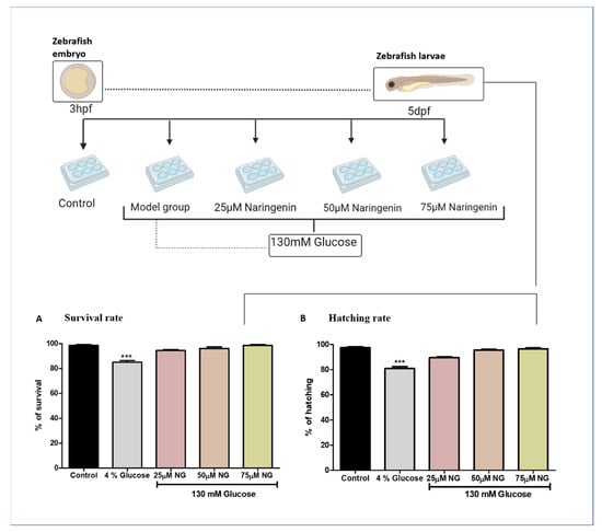 Treatment paradigm for the exposure of NG to zebrafish embryos. Effect of NG in co-exposure with 130 mM glucose on (A) survival and (B) hatching rates in zebrafish larvae. Experiments were performed in triplicate, and the data were expressed as mean ± SD. *** represents the significant difference p < 0.001 compared to the control.