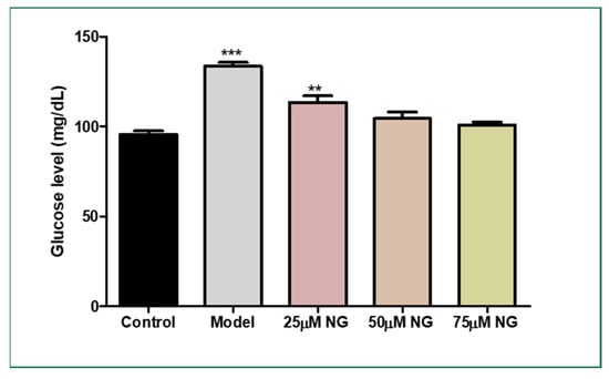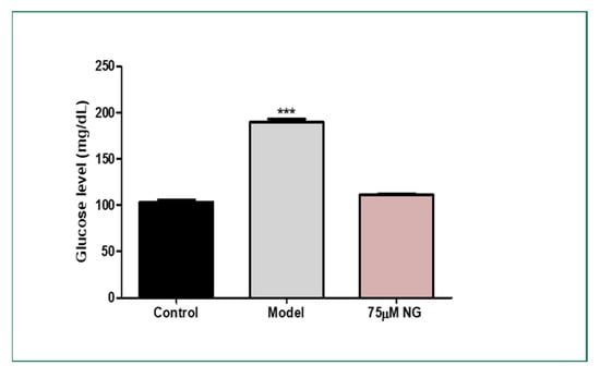 The total glucose levels were estimated in the pooled supernatant of the zebrafish larvae. Higher glucose levels were observed in the model group (133.5 mg/dL) compared to the control group (95 mg/dL). NG at a concentration of 75 µM almost reversed the condition (102.5 mg/dL), almost similar to the control group (Figure 2).