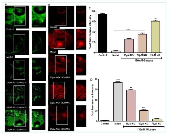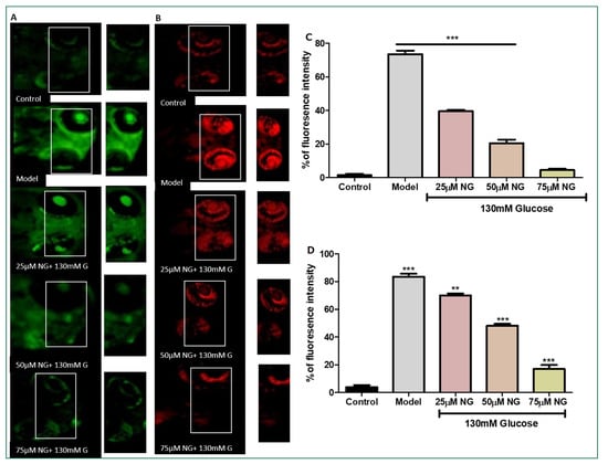 Glucose causes retinal damage in the diabetic condition through recurrent acute and cumulative alterations that can cause tissue destruction []. The retina contains the most polyunsaturated fatty acids and has the highest oxygen absorption and glucose oxidation []. This process makes the retina more vulnerable to oxidative stress. It has been proposed that the relationship between hyperglycaemia, redox homeostasis alterations, and oxidative stress is crucial in developing diabetic retinopathy. Therefore, when stained with DCFH-DA, high fluorescent intensity was observed in the ocular region due to high levels of ROS induced by glucose treatment, whereas the co-exposure of NG reduced the levels of ROS in a dose-dependent manner, almost similar to the control group.