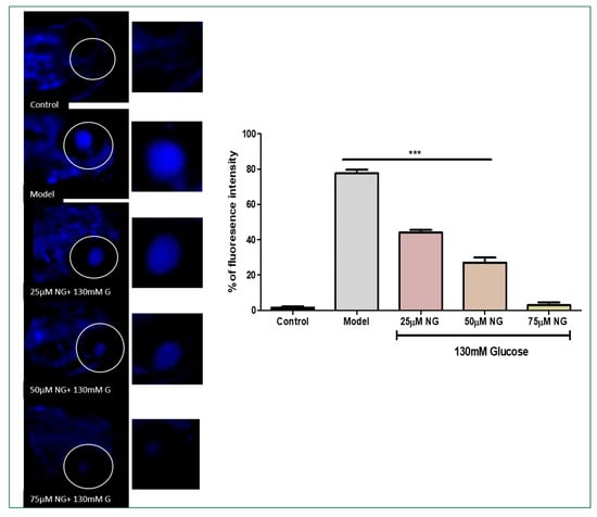 AO staining distinguishes apoptotic cells []. Therefore, the results from AO staining showed that the model group had higher prominent apoptotic cells or cells underdoing cellular damage. Apoptosis was also noticeably increased in the ocular region of the model group (75%). In contrast, the frequency of apoptotic cells developed in the ocular region in the NG-treated groups was considerably less. At a minimal NG concentration of 25 μM, 57% was observed, and, at a higher NG concentration of 75 μM, 5% of poor fluorescence intensity was observed, indicating the inhibition of cellular damage. Therefore, NG could prevent cell death caused by high glucose treatment (Figure 4B).