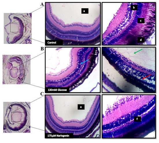 The histopathological examination of zebrafish eye (Lateral section): (A) Control; (B) Model group (Glucose treated); (C) Treatment group; (a) lens; (b) retinal cells; (c) rods and cones; (d) Pigment epithelium in the control group. The red arrow indicates a disruption in the retinal cell layer; the blue arrow indicates the vacuole formation and necrosis in the rods and cones layer; the green arrow indicates the massive destruction in the lens. (e) lens and (f) the layers of the retina being normalized after the treatment.