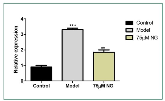 Effect of 75 μM NG on the mRNA expression of VEGF. Data were expressed as mean + SD of three independent experiments. ** represents the significant difference p < 0.01 and *** represents p < 0.001.