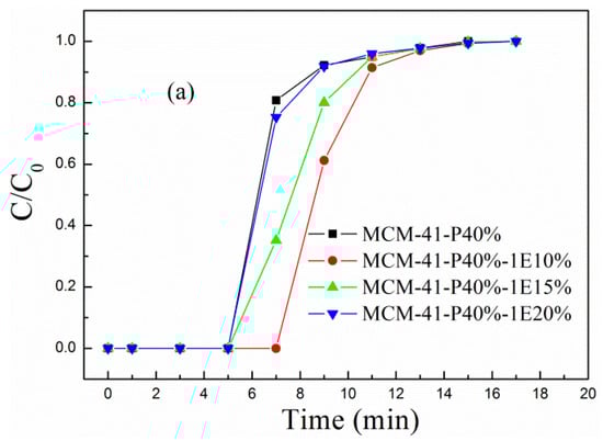 Figure 3 and Figure S1–S3 (in Supplementary Materials), respectively, describe the (a) breakthrough adsorption curves and (b) adsorption capacity for MCM-41-P40% before and after coimpregnation with 1E, 2E, 3E and 4E, when the influent velocity of the simulated flue gas was 30 mL/min and adsorption temperature was 60 °C. For MCM-41-P40%, the breakthrough time, breakthrough and equilibrium adsorption capacity were, respectively, 5 min, 1.00 and 1.34 mmol/g; as the 1E, 2E and 4E loading increased to 20 wt.%, the breakthrough adsorption curves all moved first to the right and then to the left, with corresponding breakthrough and equilibrium adsorption capacity first increasing and then decreasing; when the 1E loading was 10 wt.%, the breakthrough and equilibrium adsorption capacity were, respectively, 1.41 and 1.81 mmol/g, increasing 41% and 35.1%, respectively, compared to the corresponding value of MCM-41-P40%; when 2E loading was 10 wt.%, the breakthrough and equilibrium adsorption capacity were, respectively, 1.41 and 1.75 mmol/g, increasing to 41% and 30.6%, respectively, compared to corresponding value of MCM-41-P40%; when 4E loading was 10 wt.%, the breakthrough and equilibrium adsorption capacity were also, respectively, 1.41 and 1.75 mmol/g, increasing, respectively, to 41% and 30.6% compared to corresponding value of MCM-41-P40%. However, for the 3E-coimpregnated MCM-41, the breakthrough adsorption curves moved left, and corresponding adsorption performance decreased. Therefore, 1E, 2E and 4E-coimpregnation promoted the dispersion and exposure of the active sites in PEPA, in which the positive effect of 1E was the most obvious, so MCM-41-PEPA40%-1E10% was selected to further studied.