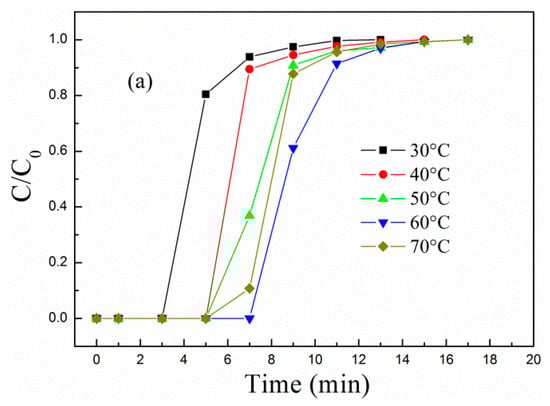 As the adsorption temperature increased from 30 to 70 °C, the breakthrough adsorption curves in Figure 4a first moved to the right and then to the left, and corresponding breakthrough and equilibrium adsorption capacity in Figure 4b first increased and then decreased, suggesting that the adsorption of MCM-41-P40%-1E10% is mainly chemisorption. The higher the adsorption temperature, the more active the PEPA is, but adsorption is exothermic, and too high a temperature is not favorable for CO2 adsorption. Thus, the adsorption of MCM-41-P40%-1E10% first increased and then decreased as the adsorption temperature increased, and, at 60 °C, the breakthrough and equilibrium adsorption capacity separately reached the maximum value of 1.41 and 1.81 mmol/g.