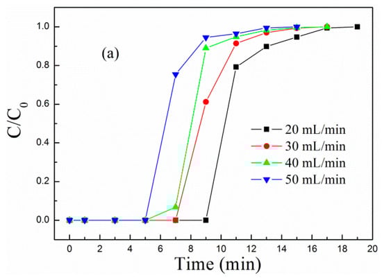 Figure 5 shows the (a) breakthrough adsorption curves and (b) adsorption capacity of MCM-41-P40%-1E10% at different influent velocities when the adsorption temperature was 60 °C. As the influent velocity increased from 20 to 50 mL/min, the breakthrough adsorption curves moved left, and the corresponding adsorption capacity decreased. When the influent velocity was 20 mL/min, the breakthrough and equilibrium adsorption capacity were, respectively, 1.81 and 2.16 mmol/g.