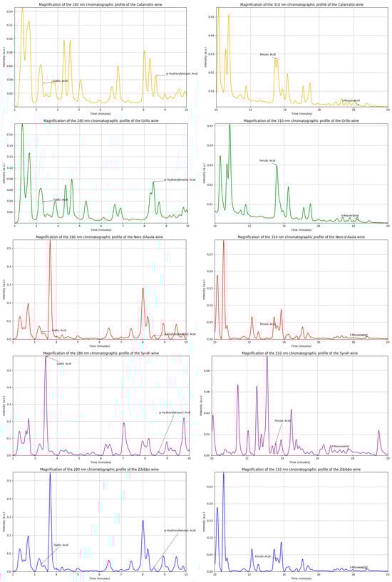 Chromatographic profiles of four phenolic compounds determined in Cataratto (yellow), Grillo (green), Nero D’Avola (red), Syrah (purple), and Zibibbo (blue).