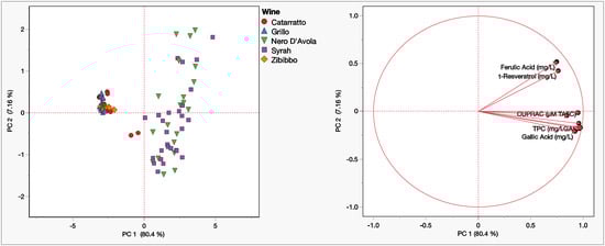 Table 4 reports the percentage contribution of the variables in each PC. Notably, all the variables analyzed contribute almost equally to the construction of the first PC and are, therefore, all necessary to distinguish the red wines from the white wines. On the other hand, the second PC is predominantly influenced by ferulic acid (64.8%), to which the separation between the various wine samples could be attributed.