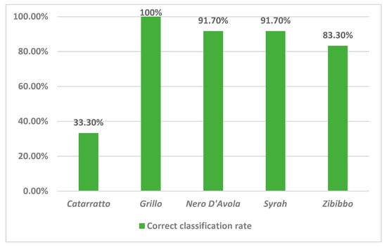 Once the natural grouping of the samples was highlighted in the PCA, the data were used to build a recognition tool for the five types of wines analyzed. A Linear Discriminant Analysis (LDA) was tested to classify the samples according to their typology. Table 5 reports the confusion matrix of the wine samples according to their varieties, while Figure 3 reports the correct classification rates.