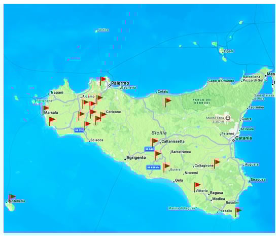 A total of fifty wines from Sicilian wineries were analyzed. The samples are of the Grillo (n = 12), Catarratto (n = 12), Zibibbo (n = 12), Nero D’Avola (n = 12), and Syrah (n = 12) varieties. The wineries are located in the following Sicilian municipalities: Grisi, Marzamemi, Serradifalco, Riesi, Partinico, Menfi, Butera, Santa Ninfa, Petrosino, Camporeale, Pantelleria, Sambuca di Sicilia, Contessa Entellina, Vittoria, Castelbuono, Licodia Eubea, Marsala, Salaparuta, and Nuova Gibellina, located in the provinces of Agrigento, Palermo, and Trapani, as reported in Figure 4. The samples were produced from 2019 to 2021. Two bottles from different production batches were collected for the same year of production.