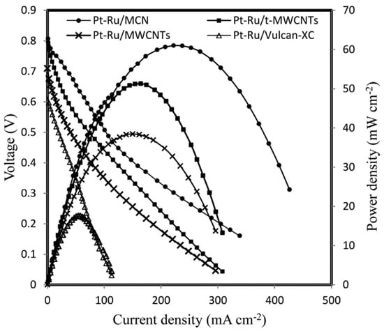 Goel et al. [] compared the performance of direct ethanol fuel cells (DEFCs) with mesoporous carbon nitride (MCN), multiwalled carbon nanotubes (MWCNTs), treated t-MWCNTs, and carbon Vulcan-XC-supported PtRu anode catalysts. As shown in Figure 2, the DEFC with PtRu/MCN as the anode catalyst delivered the best performance due to the high mesoporosity and amorphous framework of the MCN support. Zhang et al. [] fabricated a gC3N4 nanosheet-supported Pt catalyst. Pt nanoparticles were dispersed on gC3N4 nanosheets with a particle size of 1.84 nm. To increase the electron-transfer pathways on the Pt surface, acid-treated carbon black (ac-CB) was added to the Pt/gC3N4 Pt catalyst. Considerable durability of the Pt/gC3N4-ac-CB catalyst was observed. Following an accelerated durability test (ADT) of 5000 scanning cycles in a 2 mol L−1 H3PO4 electrolyte, the retained electrochemically active surface area (ECSA) of Pt/gC3N4–C was remarkably higher (87.6%) than that of Pt/C (54%). Moreover, during a 100 h durability test in an HT-PEMFC with Pt/C as the cathode catalyst, the voltage decay rate was 91 μV h−1, while a negligible decay (4 μV h−1) was observed for the cell with Pt/gC3N4–C as the cathode catalyst.