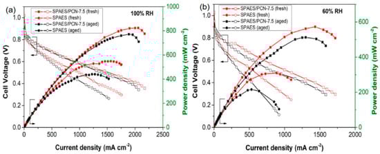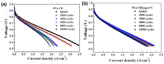 Polarization curves of PEMFCs using (a) Pt/a-CB and (b) Pt/a-CB@pg-CN cathode catalysts for a different number of potential cycles. Reproduced from Ref. [], copyright 2018, with permission from Elsevier.