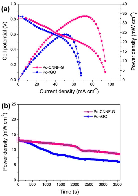 (a) Steady-state polarization power-density curves; (b) discharge curves at 0.35 V of the DFFCs using Pd-CNNF-rGO and Pd-rGO as anodes at 60 °C. Reproduced from Ref. [], copyright 2016, with permission from Elsevier.