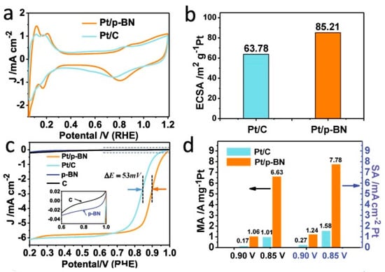 Porous BN (p-BN) is a type of h-BN material that has a large surface area and a high number of pores. The high porosity allows catalyst nanoparticles to anchor to the support surface. Li et al. [] prepared a p-BN-supported Pt catalyst by using an impregnation reduction method. Ultra-fine platinum particles were dispersed on p-BN pore edges. According to the cyclic voltammetry (CV) curves in Figure 5a, the ECSA values of p-BN and Pt/C were calculated. As shown in Figure 5b, the ECSA of Pt/p-BN was larger than that of the Pt/C catalyst, attributed to the ultra-fine size and high dispersion of platinum on the substrate. ORR polarization curves for Pt/p-BN and Pt/C catalysts are shown in Figure 5c. The onset potential (Eonset) and half-wave (E1/2) for the Pt/p-BN catalyst were more positive than those for Pt/C, confirming the synergic effect between Pt and p-BN. The mass activity (MA) and specific activity (SA) of Pt/p-BN and Pt/C are shown in Figure 5d. At 0.90 and 0.85 V, Pt/p-BN showed an MA of 1.06 A mg−1 Pt and 6.63 A mg−1 Pt, respectively, which are 6.23 and 6.56 times larger than those of Pt/C. The SAPt/p-BN/SAPt/C ratio at 0.90 and 0.85 V is 4.59 and 4.92, which is much higher than that of ECSAPt/p-BN/ECSAPt/C (1.33), indicating that the enhancement of MA of Pt/p-BN is, overall, due to the co-catalytic effect of p-BN support. Moreover, Pt/h-BN showed excellent durability in acid media. Following ADT (10,000 cycles), the ECSA of Pt/p-BN decreased by only 0.62%, and the MA by 7.1% at 0.90 V. Conversely, the ECSA of Pt/C decreased by 10.7% and the MA by 57.0%. Huang’s research group [,] used p-BN with different morphologies, meaning BN nanofibers (BNNFs) and BN microfibers (BNMFs), as supports for Pd nanoparticles. Pd was anchored to p-BN by an impregnation reduction method. Both Pd/BNMFs and Pd/BNNFs delivered higher FAOR activity and stability than Pd/C, ascribed to the high dispersion of the Pd nanoparticles on the p-BN surface.