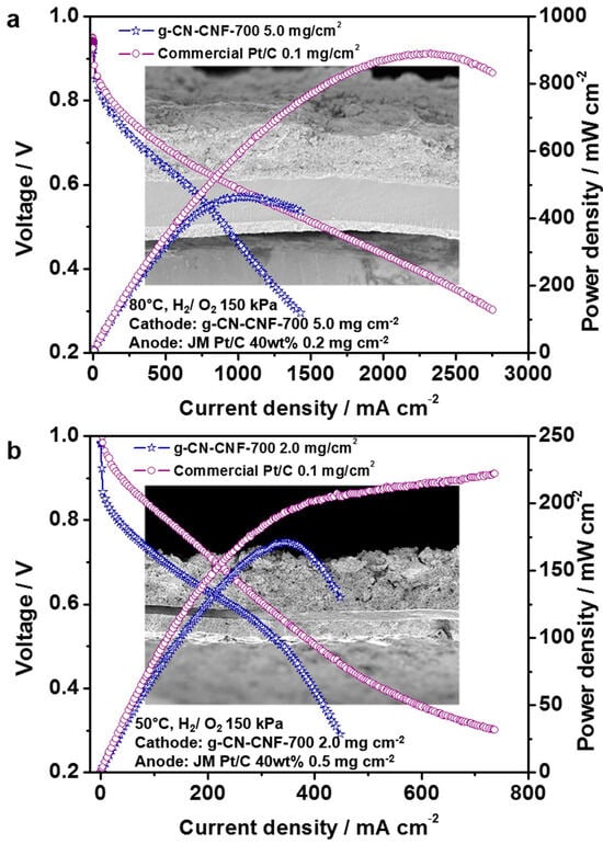 Polarization curves of PEMFCs and AFCs with g-CN-CNF-700 and Pt/C cathode catalysts. (a) PEMFC operated at 80 °C; (b) AFC operated at 50 °C. Figures in the background are cross-sectional FE-SEM images of the g-CN-CNF-based MEAs. Reprinted from Ref. [], Kim et al. Sci. Rep. 2015, 5, 8376. https://creativecommons.org/licenses/by/4.0/ (accessed on 17 April 2025).
