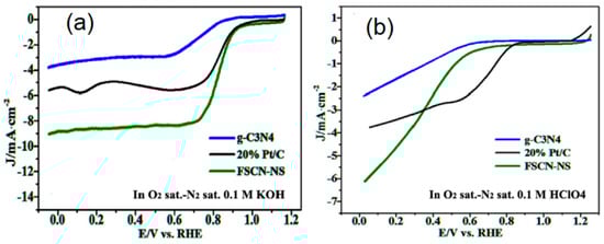 Comparison of the polarization curves of g-C3N4, FSCN-NS, and Pt/C at 1600 rpm in O2-saturated electrolyte at 10 mV s−1 in an alkaline (a) and acid (b) media. Reproduced from Ref. [], copyright 2019, with permission from Elsevier.