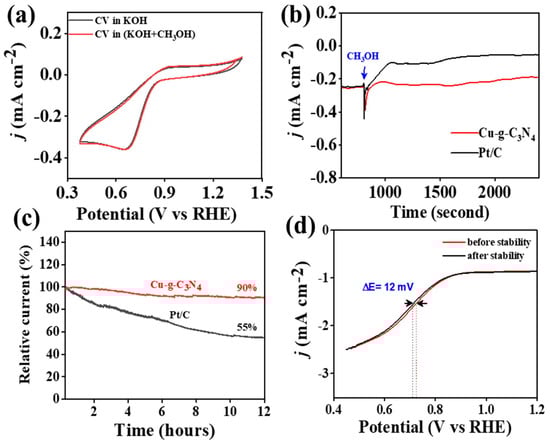 (a) CV curves of Cu-g-C3N4 and g-C3N4 before and after the addition of 1 M CH3OH; (b) chronoamperometry (CA) of Cu-g-C3N4 and Pt/C in O2-saturated 0.1 M KOH at 0.57 V with 1 M CH3OH added after 800 s; (c) CA of Cu-g-C3N4 and Pt/C at 0.57 V in O2-saturated KOH solution at 1600 rpm; (d) ORR polarization curves of Cu-g-C3N4 at 1600 rpm with 10 mV−1 before and after stability. Reproduced from Ref. [], copyright 2019, with permission from Elsevier.