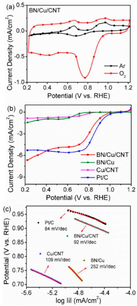 (a) CV curves of h-BN/Cu/CNT in O2-saturated and Ar-saturated 0.1 M KOH. (b) LSV curves and (c) Tafel plots of h-BN/Cu/CNT, h-BN/Cu, Cu/CNT, and Pt/C catalysts in O2-saturated 0.1 M KOH. Reproduced from Ref. [], copyright 2023, with permission from Elsevier.