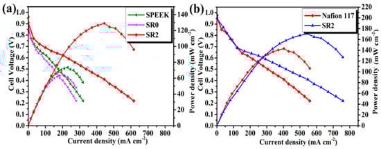 Polarization and power density curves of PEMFCs with (a) SPEEK, SR0, and SR2 membranes at 50 RH% and (b) SR2 and Nafion117 membranes at 75 RH%. Reproduced from Ref. [], copyright 2022, with permission from Elsevier.