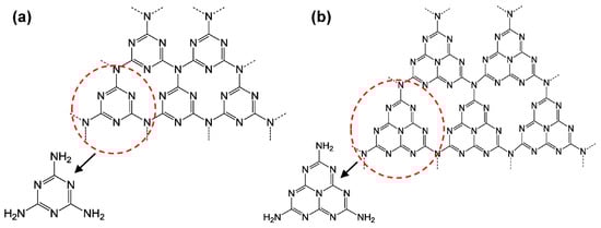Two-dimensional carbon nitride and boron nitride are promising and widely used materials. Recently, graphitic carbon nitride (g-C3N4) and hexagonal boron nitride (h-BN) compounds attracted remarkable attention related to their resemblance to graphene [,]. In g-C3N4, C and N atoms adopt sp2 hybridization and are interconnected through σ bonds. The hexagonal structure comprises triazine rings, or hexatomic rings, which are attached to a smaller unit σ through C-N bonds. There exist two chemical structures for g-C3N4, featuring triazine rings (C3N3) and tri-s-triazine rings (C6N7). Scheme 1 shows the structures of triazine and tri-s-triazine.