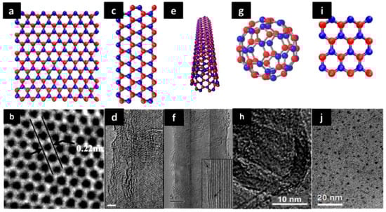 Schematic representation of h-BN nanomaterials: (a,b) h-BN nanosheets (h-BNNSs); (c,d) h-BN nanoribbons (h-BNNRs); (e,f) h-BN nanotubes (h-BNNTs); (g,h) h-BN fullerenes (h-BNFLs); (i) h-BN quantum dots (h-BNQDs). Reproduced from Ref. [], copyright 2022, with permission from Elsevier.
