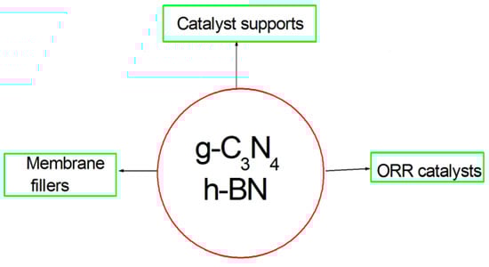 A polymer electrolyte membrane fuel cell is essentially composed of the membrane electrode assembly (MEA) and the bipolar plates (BPs) [,]. The MEA includes electrodes formed by a gas diffusion layer (GDL) and a catalyst layer (CL)—the main component of which is a supported catalyst—on the anode and cathode side, respectively, and a proton exchange membrane (PEM) or an anion exchange membrane (AEM) in between []. A schematic view of the proton exchange membrane fuel cell (PEMFC) structure is shown in Figure 1. Two-dimensional nitrides are promising materials that can be used either as catalyst supports—having higher stability in PEMFC environments than the commonly used carbon supports and improving the catalytic activity of the supported catalysts by catalyst-support interactions—or as catalysts for the oxygen reduction reaction (ORR), replacing noble metal catalysts and showing good catalytic activity []. More recently, due to the layered structure with regular triangular nanopores acting as ion transport channels for H2O molecules and protons, g-C3N4 and h-BN have been used in polymer electrolyte membranes. The use of g-C3N4 and h-BN in low-temperature fuel cells is shown in Scheme 3. In this work, the feasible use of 2D nitrides as catalyst supports, catalysts for the ORR, and membrane fillers in low-temperature fuel cells is overviewed.