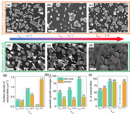 GaP NW arrays grown on an annealed SiOx/Si (111) surface with temperature gradient after treatment in “base piranha” (a–c) and nitric acid (d–f). The scale bars are 2 µm. Tdec was estimated to be 780 °C for “base piranha” and to 820 °C for nitric acid. Comparative statistical analysis provides the surface density of vertical NWs (g), fraction of substrate area covered by parasitic islands (h) and fraction of vertical NWs (i) for annealing at temperatures 5, 20 and 35 °C below Tdec.